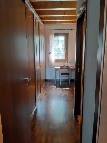 Pavimento in Veneziana per la zona giorno, ceramica per il bagno cieco con doccia e parquet per la camera da letto matrimoniale.